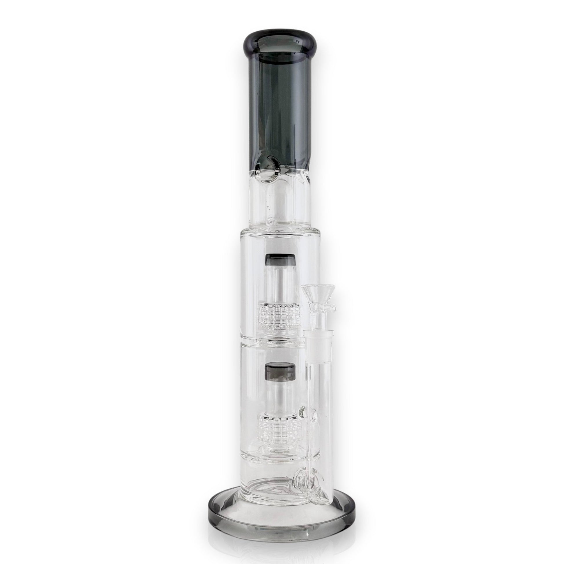 This 17-inch straight shooter water pipe is engineered for clean, powerful hits with advanced percolation. Its clear borosilicate glass body showcases the filtration system, while the grey-colored mouthpiece adds a sleek accent to the overall design.